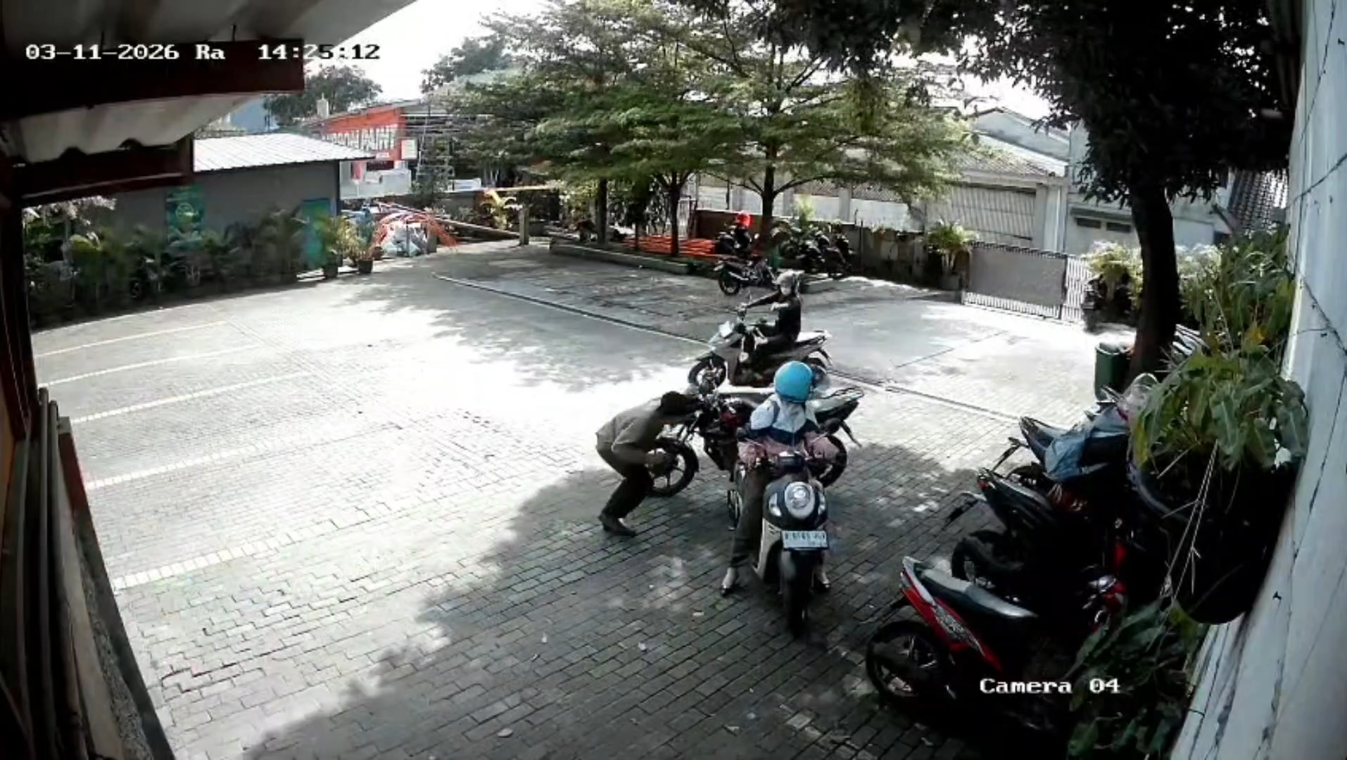 Dalam rekaman CCTV sekolah, salah satu pelaku terlihat turun dari motor dan berjalan mengamati situasi di area parkir. Setelah memastikan kondisi aman, pelaku kemudian menghampiri sepeda motor incarannya.