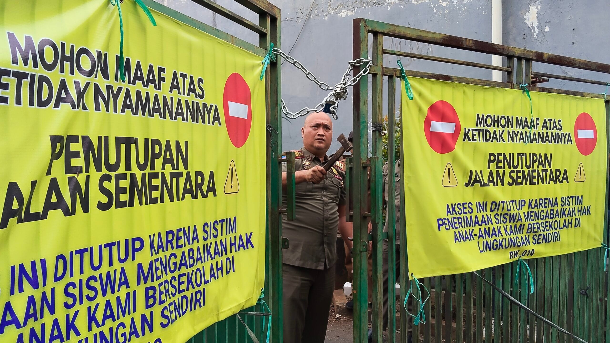 Penyegelan dilakukan dengan memasang spanduk bernada kekecewaan lantaran pihak sekolah mengabaikan hak anak-anak untuk bersekolah di lingkungannya sendiri.