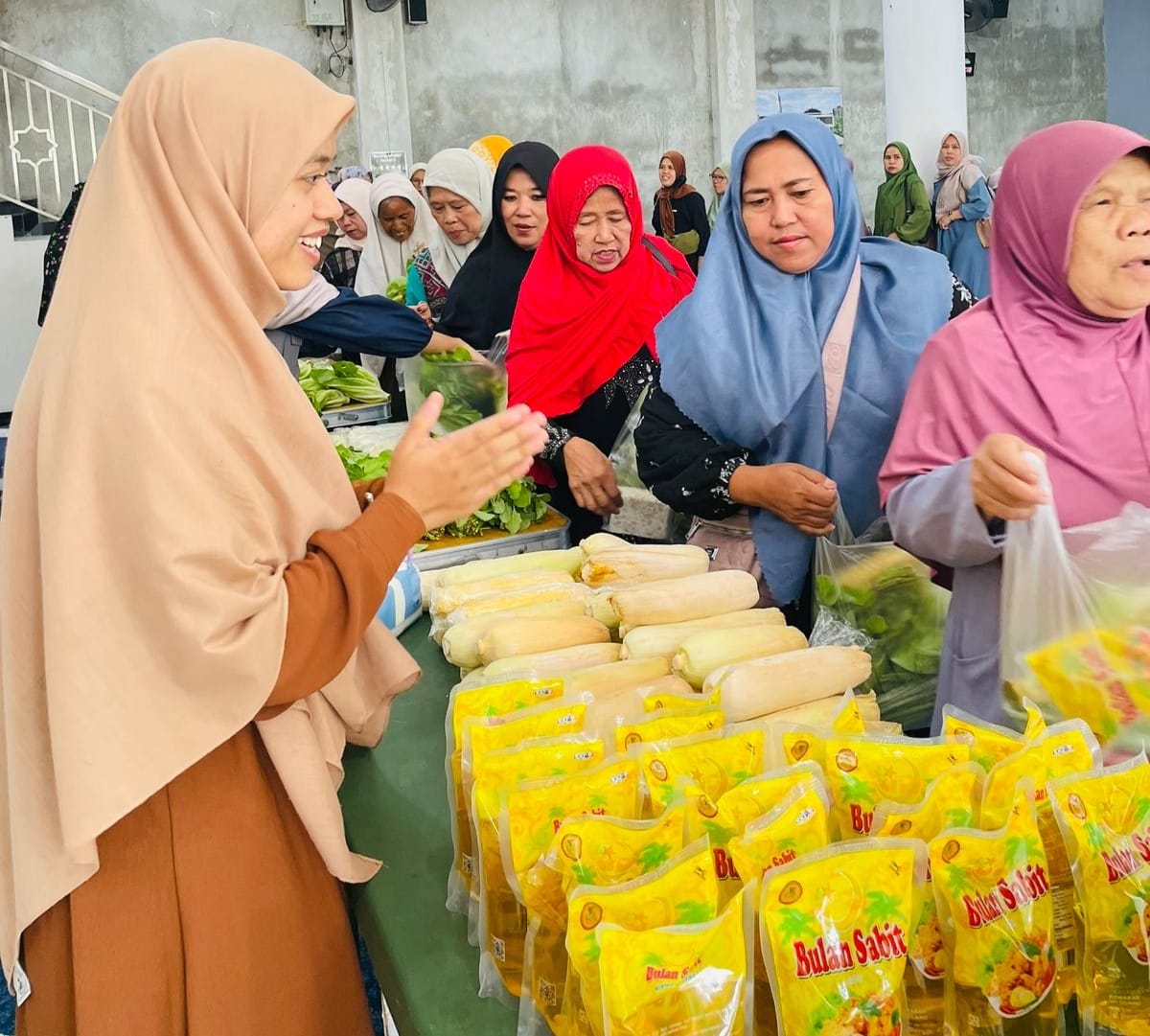 Kegiatan sosial ini menyediakan berbagai macam bahan pangan esensial, mulai dari beras, sayuran segar, minyak goreng, hingga lauk-pauk siap olah. Pasar digelar di halaman Masjid Jami Al Barokah ini langsung diserbu oleh warga yang telah menanti.