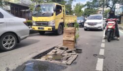 Bahayakan Pengendara, Warga Cimone Tandai Jalan Berlubang dengan Pot dan Peti Kayu